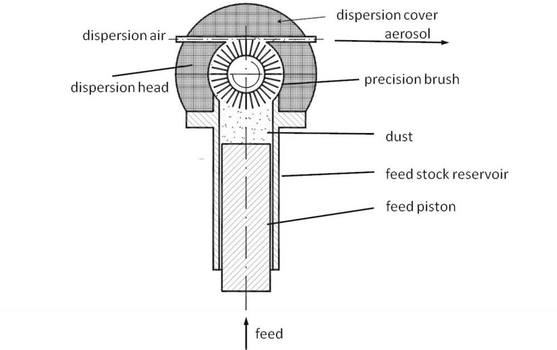 Het gevulde reservoir met vaste stof wordt in de dispergeerkop van de RBG geplaatst en het poeder, dat zo gelijkmatig over de vullaag is samengeperst, wordt met een nauwkeurig geregelde snelheid op een roterende borstel getransporteerd. Een instelbare volumestroom stroomt met zeer hoge snelheid over de dichtgeweven precisieborstel en blaast de deeltjes uit de borstel.