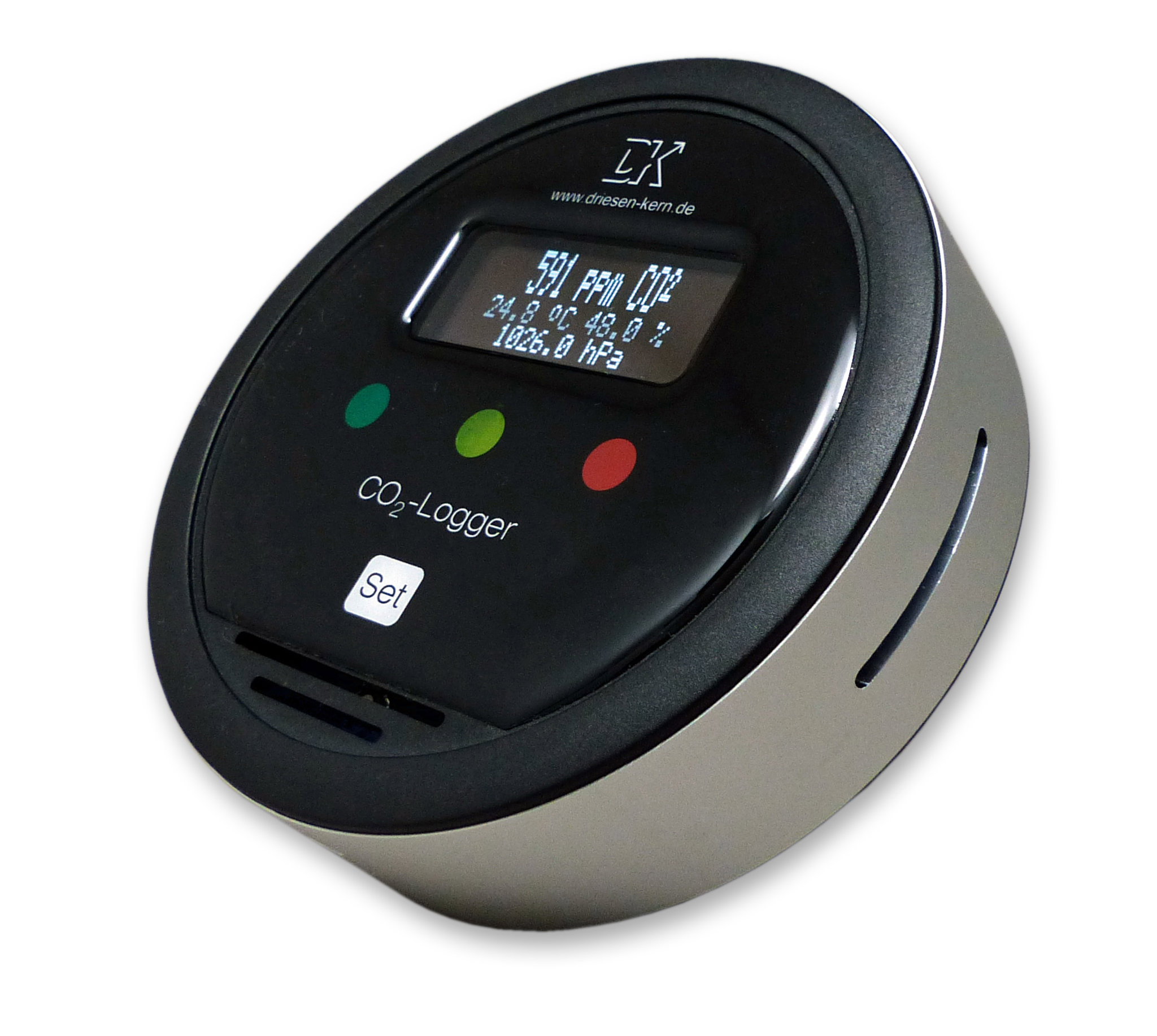 De logger is uitgerust met een verkeerslicht stijl indicatie (drie LED's) zodat snel te zien is of het binnenklimaat voldoende geventileerd is.